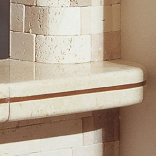 Угловой камин Abaco из кусочков разноцветного травертина. Нижняя полка выполнена из полированного кремового стоунлайта, украшена деревянной вставкой. Массивная деревянная балка.